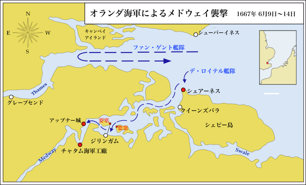 そこで、強力な艦隊を作り上げてイギリスに対する劣勢の挽回のチャンスを狙って着々と準備を進めていたオランダは、オランダにとっては前方制海域でありイギリスにとっては後方制海域であるイギリス沿岸海域への襲撃を実施することにした。