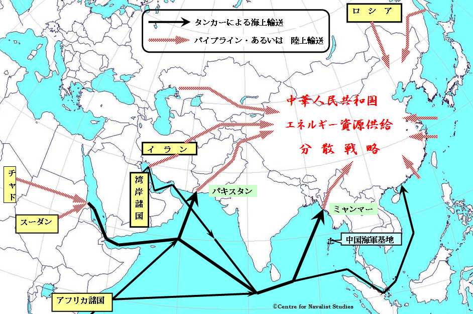 一方、中国は主としてサウジアラビア、ロシア、イランから原油を輸入しており、サウジアラビアとイランからの原油はタンカーによって、ロシアからの原油はパイプラインとタンカーによって輸入されている。そのため、中国が中国の原油輸入海洋航路帯を寸断する能力を保持した外敵と戦争状態に陥った場合、もし中国にこの外敵による航路対妨害を完全に排除することができなくとも、ロシアからのパイプラインによる輸入量を増大させることで、完全な原油輸入途絶という最悪の事態は回避することができる。現時点(2025年秋)ではイランと中国を直結する石油パイプライン建設計画は公表されていないが、建設に困難は伴うとはいえ、イランと中国は陸続きである以上、中国としてはイランとの間の石油パイプラインを建設して、原油輸入の安全性を向上させるオプションは手にしている。