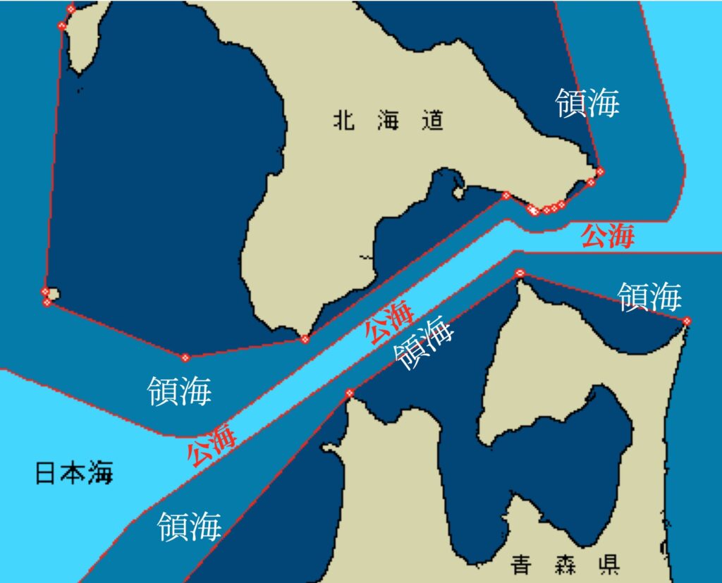 そこで、日本政府は完全に日本の領海内にある対馬海峡東水道、津軽海峡、大隅海峡に対馬海峡西水道(海峡の対岸は韓国)と宗谷海峡(海峡の対岸はロシア)を加えた五つの海峡部についてその海域の日本領海幅を12海里ではなく3海里とするという特別の規定を設けた。