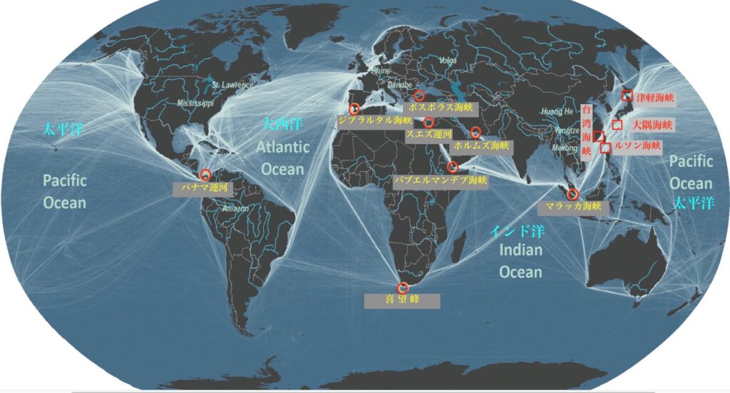 ベトナムや中国の南シナ海沿岸から公海沿岸それに韓国と、カナダとアメリカの西海岸を結ぶ最短航路は日本海あるいは西太平洋日本沿海域から北太平洋を北米大陸に向かう航路である。このルートを利用するには大隅海峡を始めとする南西諸島を横切る海峡部、対馬海峡から日本海を経て津軽海峡を通過する必要がある。そのため、それらの日本列島周辺に位置する海峡部は、海上交易にとっても軍事的にも重要なチョークポイントとなっている。